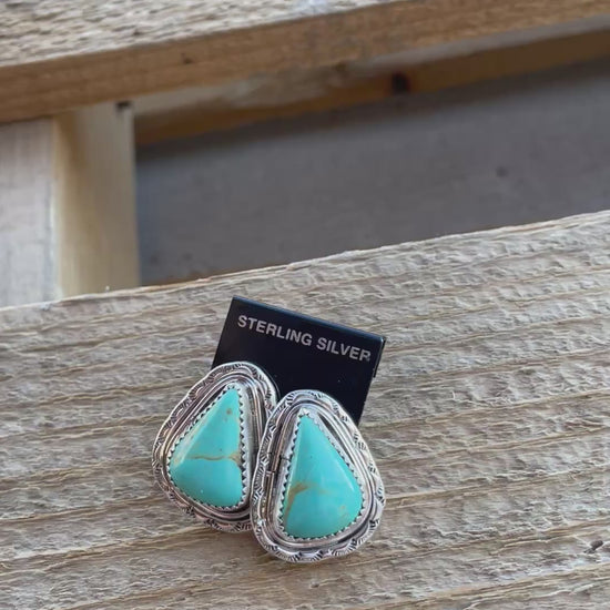The Cowboy’s Sweetheart earrings feature a light turquoise stone with a subtle hint of matrix. Just shy of an inch in length, they offer the perfect drop for a stud-style dangle. Incredible craftsmanship shows in this piece. Set in heavier sterling silver and to add to it framed with bold incredible stamped sterling silver, these are a personal favorite.
